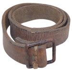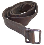 cuir très fragilisé au niveau de la boucle et nombreuses marques d’usure. Boucle oxydée. Trous rajoutés. Longueur totale 117 cm, largeur 2 cm.